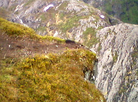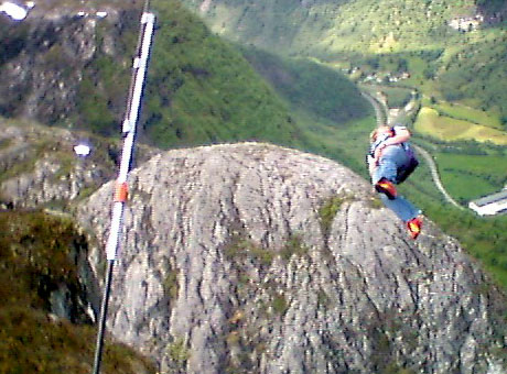 Denne delen av fjellet er 950m over havet. Det er 350m fall ned til ura under exiten. Det er regnet ca 9 sekunder fritt fall til du trekker skjermen.