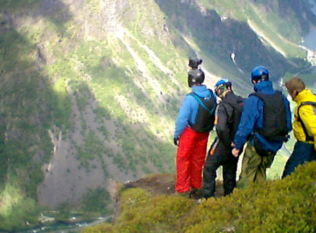Med utsikt til ryggen til Tom Erik i fritt fall, avslutter jeg blogging fra dagens BASE-hopping. Vi som ikke hadde med rigg opp er alene igjen på toppen. Og gleder oss til helikopterturen ned :)