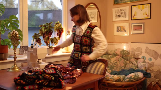 LEK: Saks og syskrin er kjærkomment å ha, når man skal lage gaver selv. Ingrid Vik Lysne bobler over av gjenbruks-glede.