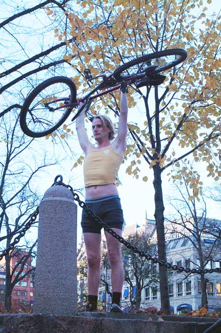 Det tok 10 minutter. Å skaffe en mann i singlet, underbukse med en sykkel i armene. |