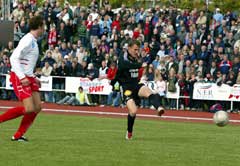Harald Martin Bratbakk scorer det første av sine tre mål mot Levanger. (Foto: Gorm Kallestad) |