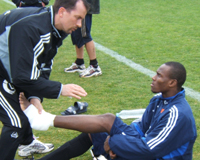 Viking Robert Mambo-Mumba måtte behandles av fysioterapeut Thor Arne Aasen etter treningen i La Manga i formiddag. Foto: Lars Navestad |