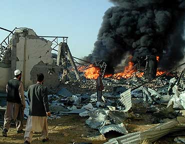 | Afghanere som arbeider for Røde Kors vandrer over restene av et varelager som ble truffet for andre gang fredag 26. oktober 2001. (Foto: Scanpix/AP/Amir Shah) |