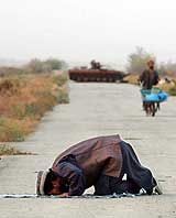 En soldat fra Nordalliansen benytter sjansen til å be på veien som forbinder Bahgram med Kabul. (Foto: Scanpix/AP/Marci Di Lauro) |