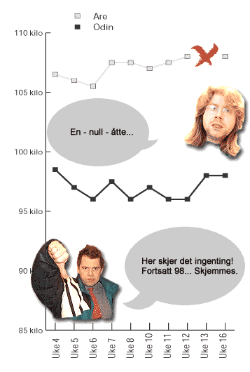 Are knuste vekta med øks og ga faen i hele prosjektet. Nå har Odin kjøpt ei ny vekt og de prøver seg på prosjektet igjen. Men de tør ikke se meg i øynene og nekter meg å bli med i studio. Likevel ringte de til meg og sa vekten. Jeg tror gutta er ærlige, for tallene var ikke bra. De har ikke gått ned et gram.
