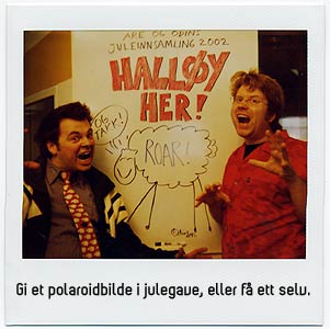 – Poenget e at aill som vil vårrå med må gi 100 krona. Dæm settes inn på konto 6401 06 00004, giveran må HUSK NAVN OG ADRESSE. Det må dæm om dæm ska få det UNIKE polaroidbildet og diplomen som vi hi lage spesielt for herre juleinnsamlinga, forklarer Odin Jensenius.