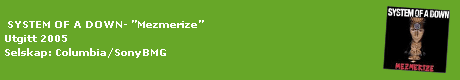 Men ting forandrer seg; etter å ha hørt på ”Mezmerize” hele helga er jeg overbevist. For en morsommere metallplate enn denne skal du lete lenger etter. Disse fire armenske amerikanerne klarer å blande humor, metall og politisk engasjement på en finurlig og smart måte. Og når de er så melodiøse at de appellerer til meg, som ikke er noen stor metall-fan, synes jeg de har gjort en god jobb. Ihuga fans vil muligens være uenige med meg i det, men dem om det.