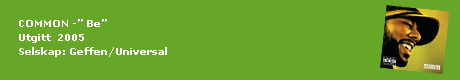 Common (tidigare Common Sense) hade redan på det tidiga 90-talet rykte om sig att vara en otroligt begåvad rappare tekniskt, med ett rasande tempo och ordmässiga krumspring som tog andan av hiphop-världen. Genomproducerat av 2004 års hiphopwonder Kanye West är ”Be” som sagt en grillplatta, och tekniken som Common blev känd för har fått vika för ett mycket segare tempo. Med grillsoundtrack menar jag tidigt på kvällen, när folk börjar droppa förbi. Men ju längre kvällen lider desto mer tydligt blir det att jazz- och soulsamplingarna blir för sega och lågmälda i längden. Inget kommer upp till nivån på singelen ”The Corner”, och jag måste säga att jag redan börjar ana en enorm K. West-backlash.