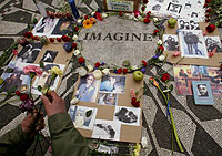 En mann legger blomster på John Lennon's minnemerke Strawberry Fields i Central Park, New York. (Foto: Diane Bondareff/AP) |