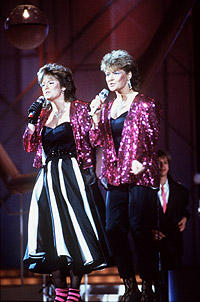 Vinnerne av Melodi Grand Prix 1985, Bobbysocks, i aksjon på scenen, Hanne Krogh (t.v.) og Elisabeth Andreassen. (Foto: Erik Thorberg/Scanpix) |