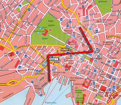 Sett et merke ved ransstedet Aker Brygge på Oslo-kartet. Og så setter du et merke ved nazienes hovedkvarter under krigen; Victoria Terasse. Deretter setter du et merke ved Filadelfia, pinsemenigheten i Oslo. Til slutt setter du et merke ved Tinghuset, der ranerne har vært mange ganger. Tegn en blyantstrek mellom disse punktene. Hva får du da?