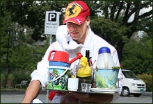 Det tok tre mann to turer å bære det ut. Og oppgaven for balansekunstner Eskil Rønningsbakken er å få med seg alt på ett brett - og sykle avgårde. Se bildene og hør de knusende tallerknene her.