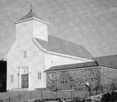 Blomvåg er også ei kvalfangarbygd. Skuta ligg fortøygd rett nedanfor kyrkja.