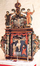 Altertavlen er om lag 300 år gammel og viser "Korsfestelsen" og den "Oppstandne Kristus" og er laget i 1623 i barokk stil.