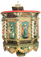 Prekestolen er laget av en billedhugger og gitt som gave til kirken om lag år 1700 av Lukas Hansen og frue.