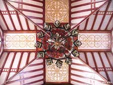 Fra taket i Vår Frelsers kirke - tatt fra midt under lysekronen og "rett til himmels" (til høyre). Selv taket er et som et kunstverk, hvor detaljene gir assosiasjoner til norske stavkirker.