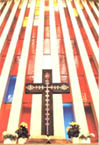 Hele veggen bak alteret er delt inn i utallige felt med farget glass som forandrer seg med sollyset.