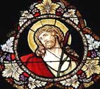 Vår Frelsers kirke har mange fantastiske glassmalerier. Dette Kristusmotivet viser først i sin fulle prakt når solen står rett inn fra vest, og er plassert like over hovedinngangen i vest (til venstre).