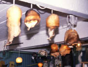 I taket henger lamper laget av oksepunger. |