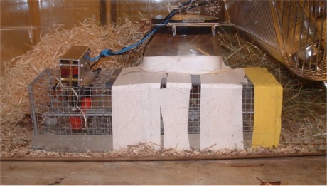 Slik ser en foringsautomat ut. På størrelse med en en-liters melkekartong og med en dør som bare slipper inn de musene som forskerne vil skal slippe inn.