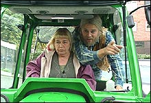 Narvestad og søsteren øvelseskjører i traktor (Foto: |
