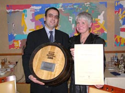 President Anne Lise Mellbye i Norske Akevitters Venner overrekker skjold og diplom til en stolt hotellsjef Ronny Gjøse på ”Midnatsol”. Foto: Johan Mellbye |