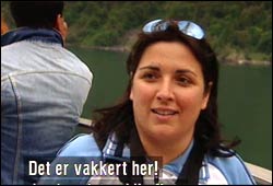 Reiseleder Unni har sin aller travleste dag på hele rundturen når turistene skal på land i Geiranger. Tempoet er høyt og trengselen stor når alle vil over i skyssbåten.
