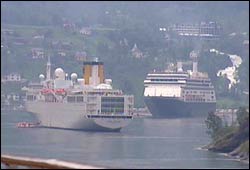 Det er trangt om plassen i Geirangerfjorden når alle cruisebåtene skal få plass. Foto: NRK |