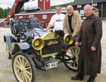 Bilen er en Metz fra 1914. Fra venstre: guide Tommy Kristoffersen, Andreas Lunnan og bileier Stein Tronsli. |