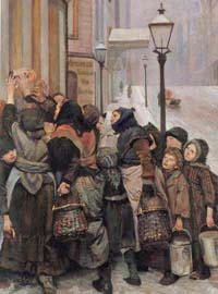 Drømmen om bygda sprang ut av storbyens elendighet, her skildret i maleriet "Kampen for tilværelsen". |