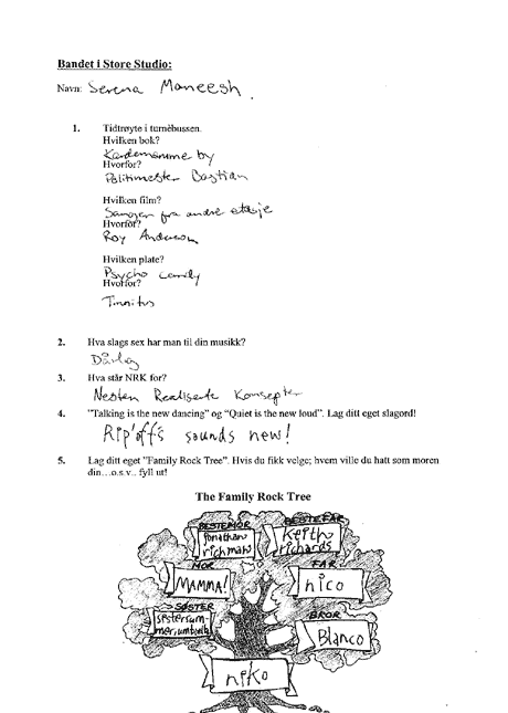 Drømmebestefar: Keith RichardsAlle band som opptrer i Store Studio må svare på samme spørreskjema. Her er svarene fra Serena Maneesh. Publisert 04.09.2002 19:06. Oppdatert 06.09.2002 11:44.