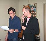 Bassist Frode Jacobsen og vokalist Sivert Høyem i Madrugada sjekker at de er enige om svarene på bandskjemaet. |