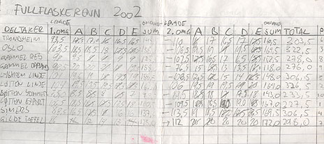 Klokka ett strøyk vi toppluene av svette hoder og sang nasjonalsangen. På signal fra papptrompet blåst av naboen i første etasje var Kjell Aukusts Minnerenn for Assoterte Miniatyrflasker i gang. Her er resultatlista: