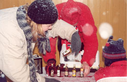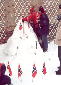 Bakgården var allerede stivpynta i metertjukk fløyelssnø. Med noen planker og et titall norske flagg ble det reist en riktig stolt hoppbakke i målestokk 1:100. Kritisk punkt lå på nøyaktig 120 centimeter og ble markert med rød konditorfarge. Ovarennet ble preppa med vannsprut fra dusjflaske og unnarennet pakket hardt som parkett. Ti flasker norske akevitter stod klare til dyst.