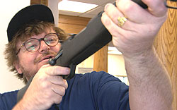 Michael Moore har provosert og engasjert mange. Her kjøper han ammunisjon over disk på Wal-Mart. |