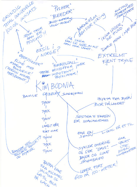 I Norgeseksil?Kim Bodnia er et ekstremt kjent tryne i Danmark, men ikke like kjent her i Norge. Annes tankekart gir deg innblikk i det bodnianske univers. Publisert 04.02.2003 11:03. Oppdatert 18.06.2003 12:15.Den danske slagbjørnen, som faktisk har en fortid som proff hundremeterløper, møter du i Store Studio Nachspiel på fredag.