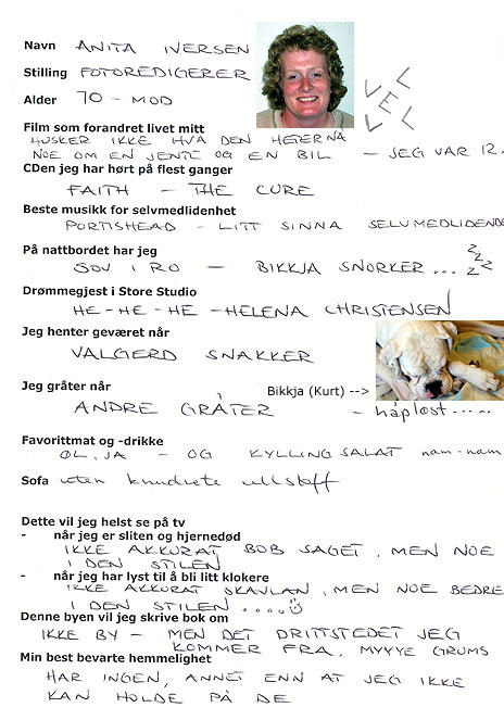 Anita IversenFotoredigerer Anita drømmer om supermodeller med sov-i-ro i øra mens bikkja hennes snorker. Publisert 08.09.2003 11:14. Oppdatert 11.09.2003 15:06.
