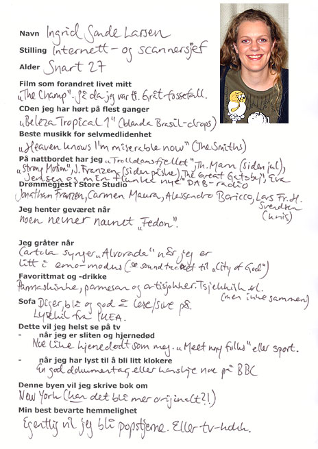 Ingrid Sande LarsenNettjournalist Sande Larsen lar bøker ligge forferdelig lenge på nattbordet og er hekta på Brasil. Publisert 08.09.2003 11:14.