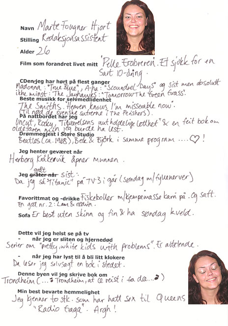 Marte Fougner HjortMarte er ny, red.ass., trønder og musikkfrik. I tillegg serverer hun den ekleste hemmeligheten vi har hørt på lenge - storfysj! Publisert 08.09.2003 11:14.