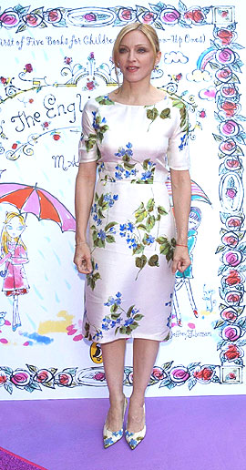 Iført et stilmessig mageplask av en kjole lanserte Madonna i går "De engelske rosene" i hundre land. Foto: Richard Lewis/AP |