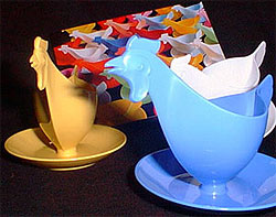 Høneformede eggeglass i plast. Stort mer Ossi blir det ikke. Foto: Mondo Arts. |