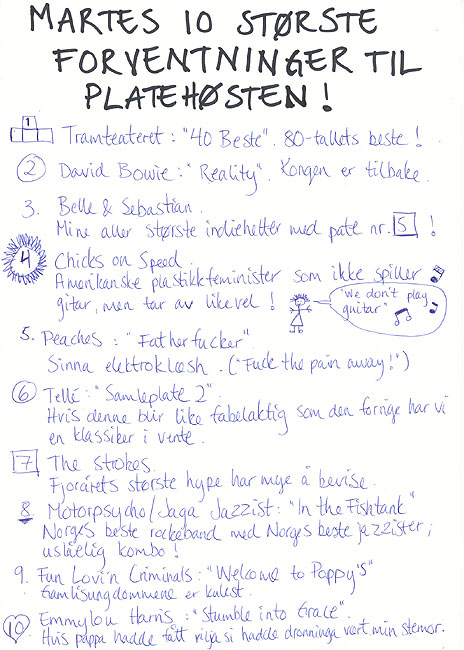 Martes ti største forventninger til platehøstenHøsten er over oss, og med den kommer masse dårlig vær og en drøss med plater. Været suger, men jeg gleder meg til skivene, ja! Publisert 22.09.2003 11:42. Oppdatert 22.09.2003 12:57.