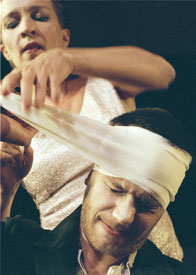 Hildegun Riise bandasjerer hodet til Nicolai Cleve Broch i Det Norske Teatrets uendelig vakre oppsetning av "Måken". |