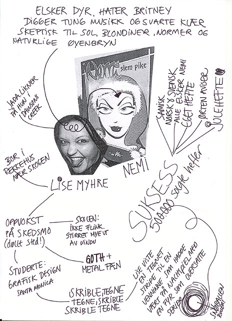 Lise Myhre tegnet Nemi for første gang i 1997 og fikk henne på trykk omtrent før blekket var tørket. Nå er den likbleike og knalltøffe jenta en av landets største tegneseriesuksesser og en ettertraktet eksportvare til aviser og blader også utenfor Norges grenser. Om få dager er årets julehefte fra Nemi i salg. Det er mer enn god nok grunn til å invitere henne til Store Studio.