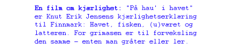 Ukens vinner i pressemeldingsbunken: et presentasjonsskriv for Knut Erik Jensens nye film "På Hau i havet". Vi fryder oss over den brutale, nesten pornografiske romantiseringen av Finnmark og Finnmarkinger. Vi gjør oppmerksom på at stygge scener kan forekomme. Les selv og le. Eller gråt.