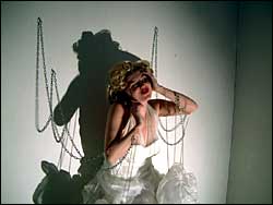 Kate som Marilyn Monroe: hvit kjole, blond parykk, fyldige lepper. Alt som det berømte sexsymbolet - bortsett fra lenkene hun har festet til huden med sylskarpe kroker. |