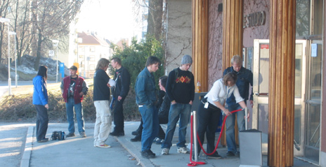 Over tre timer før innspillingsstart var de første publikummerne på plass, og det dannet seg kø. Ingunn Vold Johnsen, publikumsansvarlig, ordner køen. (Foto: Anita Iversen) |