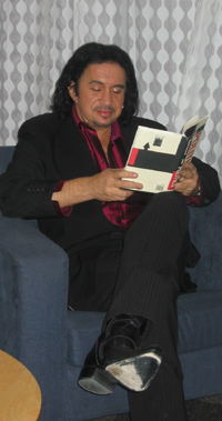 Nei, det er ikke Bilbo Baggins. Det er Gene Simmons som leser litt i "Politics" på bakrommet før sending. |
