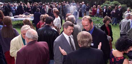 Forfattere, skuespillere, reality-kjendiser og politikere sto i mindre grupper, og pratet avansert om ny lyrikk på Aschehougs hagefest torsdag. (Foto: Scanpix) |