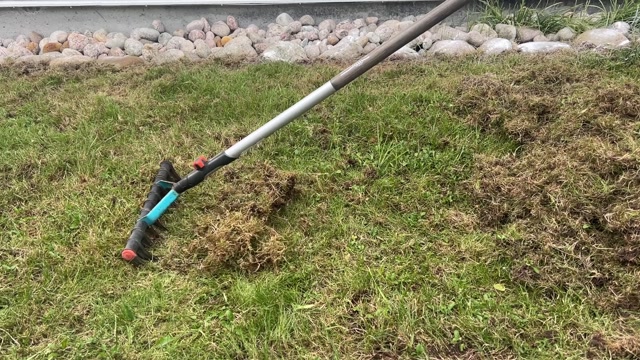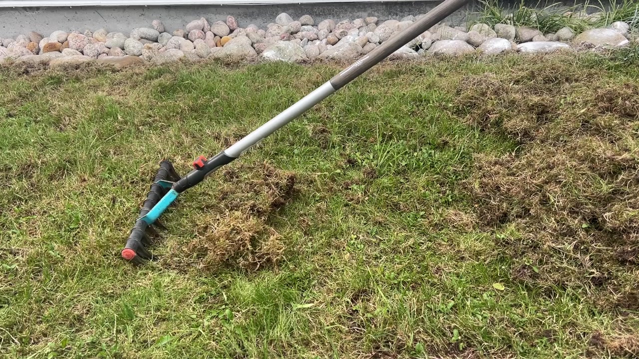 – Jeg har en enkel plenlufter - en vertikalskjærer som ikke koster mer enn en god tusenlapp, og en god rake som lufter plenen.